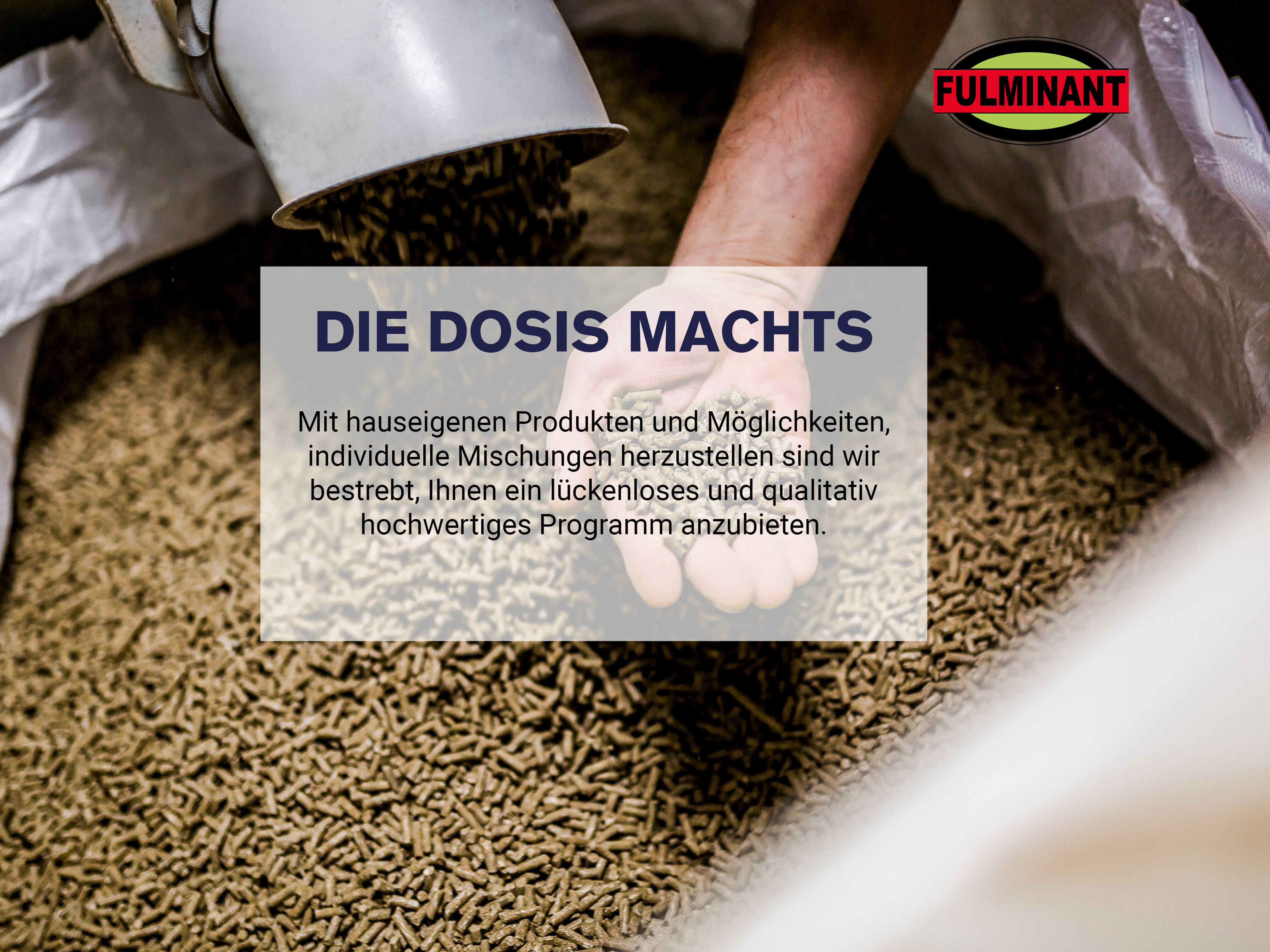 FULMINANT Futtermittel bietet eine Vielzahl an innovativen Produkten für die Fütterung und Haltung landwirtschaftlicher Nutztiere. Neben unserem Standardprogramm an Futtermitteln haben wir uns auf die Herstellung von Leckmasse, sowie auf Lohnproduktion für Händler und Hersteller spezialisiert.